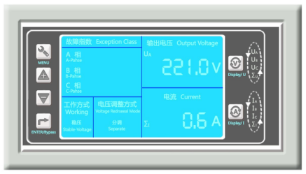 GTZW系列無觸點穩壓器采用LCD大屏幕液晶顯示,通過LCD液晶屏幕能直觀顯示電壓、電流、故障狀態、工作方式等參數。其穩壓精度、輸出電壓、工作方式等可通過面板設定,操作簡單。